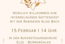 Am 15.02.2026 und am 01.03.2026 feiern wir jeweils um 14.00 Uhr einen interreligiösen Gottesdienst. Wir wollen unsere jüdischen und muslimischen Glaubensgeschwister kennenlernen, von und mit ihnen lernen.